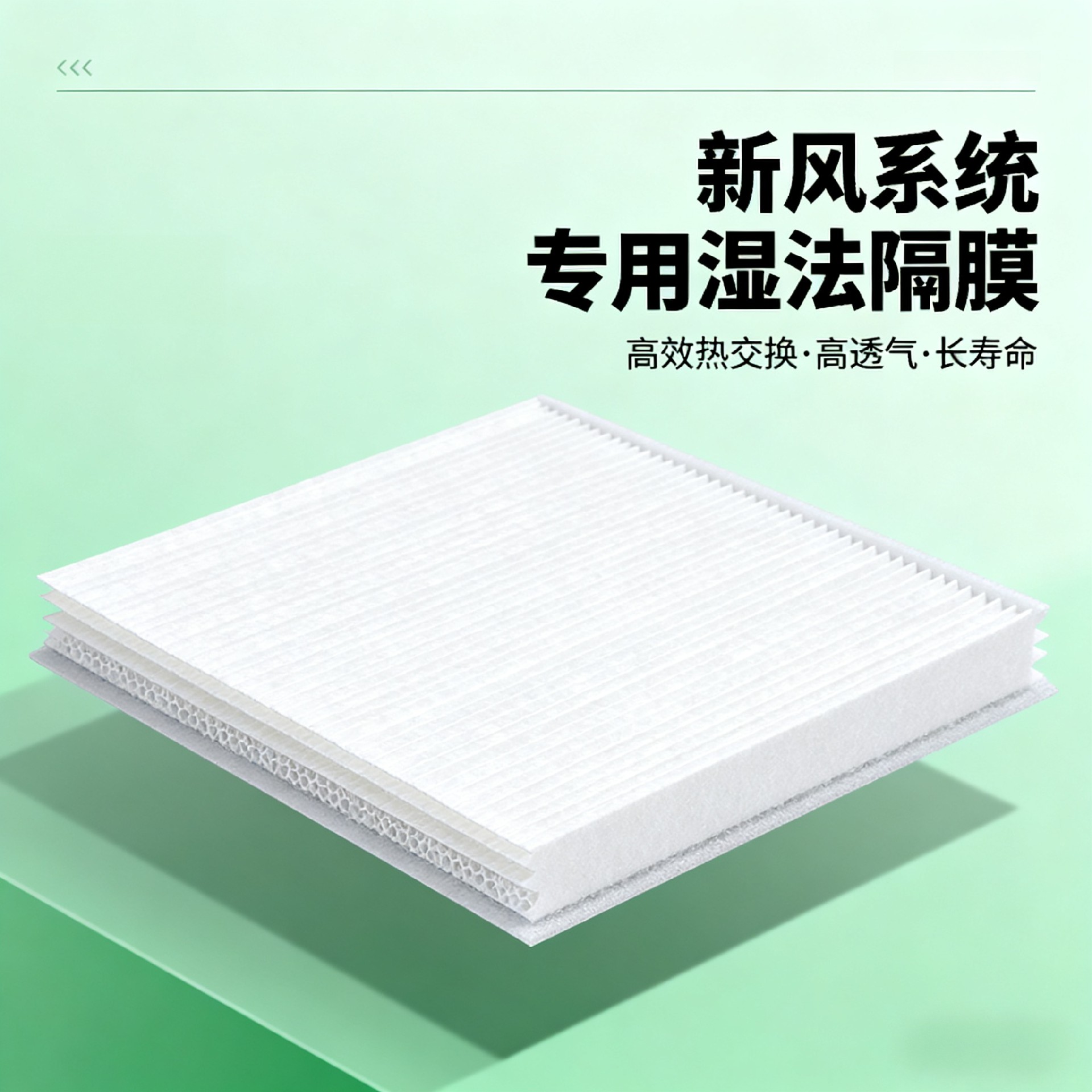- 新风系统专用隔膜采用精密湿法工艺制成,具备高透气性与均匀微孔结构,能高效拦截空气中的粉尘杂质,同时保障优异的热湿交换性能,耐温耐湿、抗拉伸强度高,可适配各类全热交换芯体,有效降低设备运行噪音与能耗,延长维护周期,是提升新风系统能效、稳定性及使用寿命的核心功能性材料。