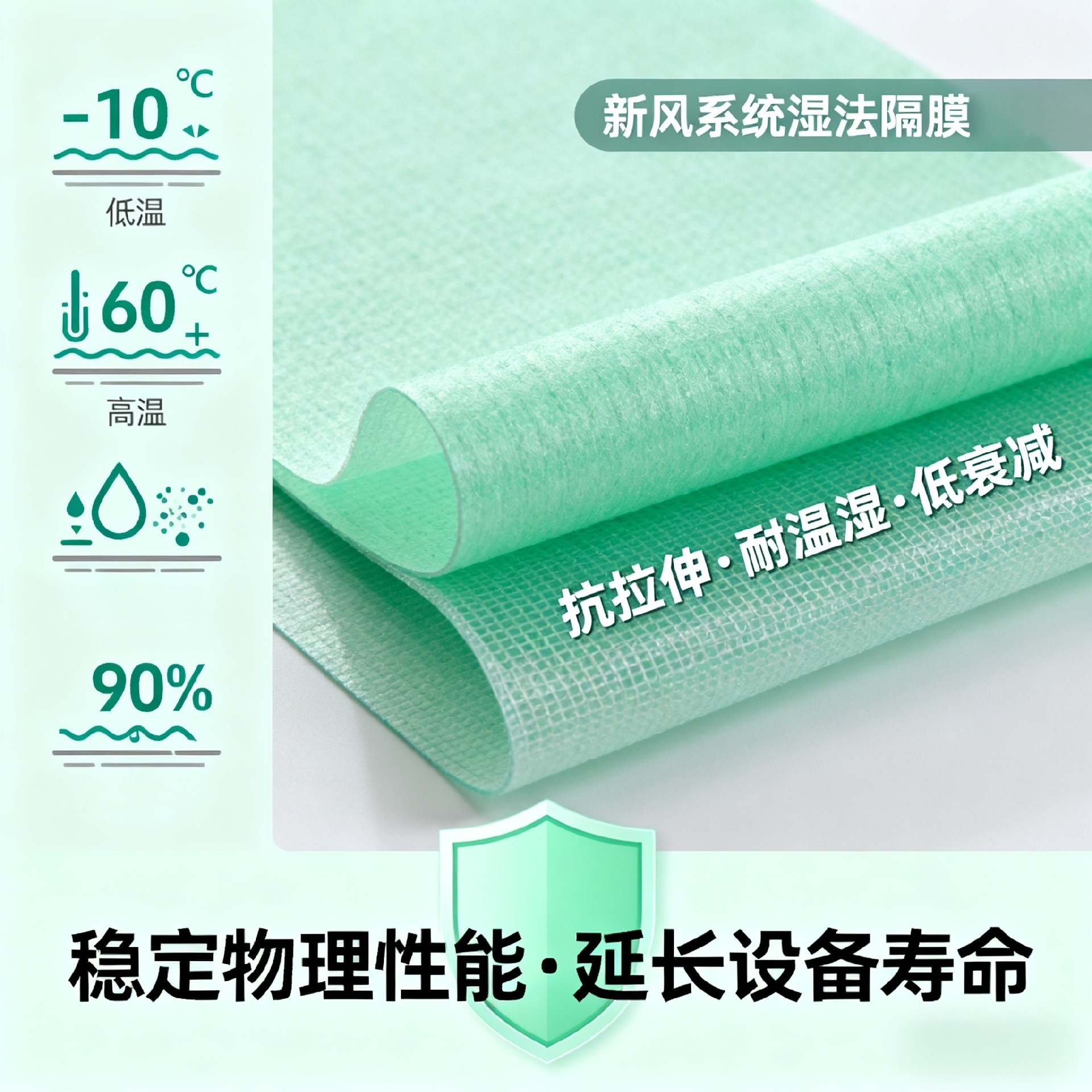 - 新风系统专用隔膜采用精密湿法工艺制成,具备高透气性与均匀微孔结构,能高效拦截空气中的粉尘杂质,同时保障优异的热湿交换性能,耐温耐湿、抗拉伸强度高,可适配各类全热交换芯体,有效降低设备运行噪音与能耗,延长维护周期,是提升新风系统能效、稳定性及使用寿命的核心功能性材料。
